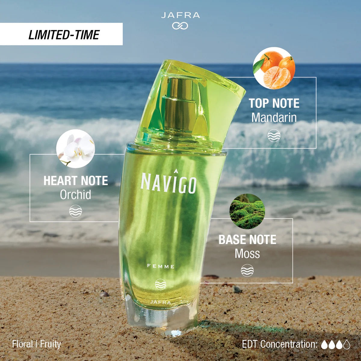 Capture the allure of the untamable sea with Navîgo Femme, a captivating fragrance that invites you to chase the horizon with notes of airy citrus and flowers balanced by timeless musk and oakmoss.