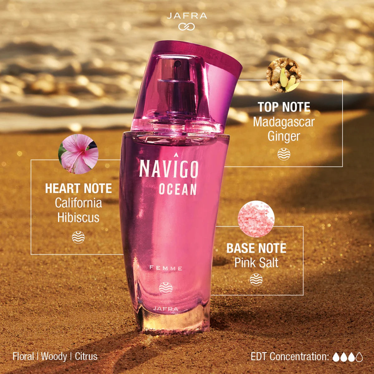 Experience the liberating allure of Navîgo Ocean Femme, a refreshing blend inspired by California, to ignite your passion and transport you to an oceanic escape, where salt-kissed golden sand will set you free.